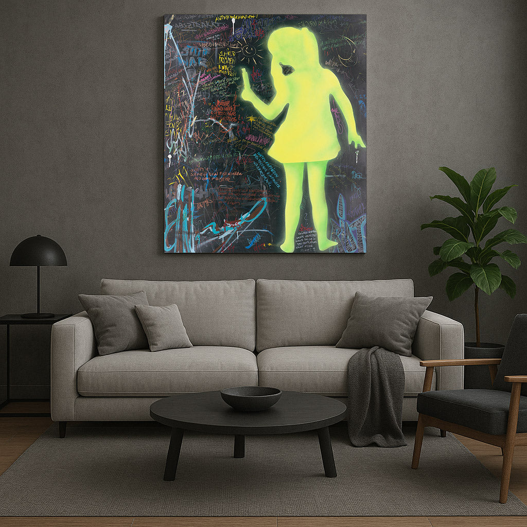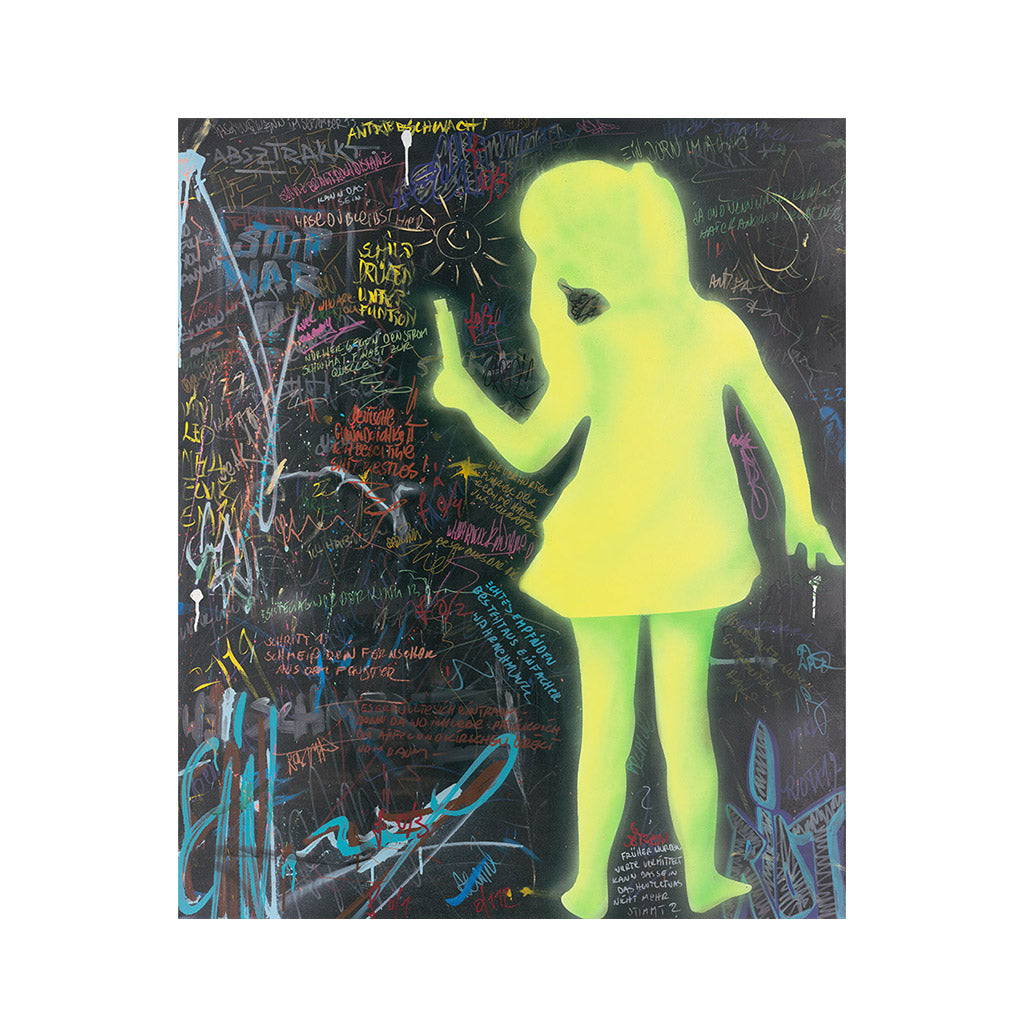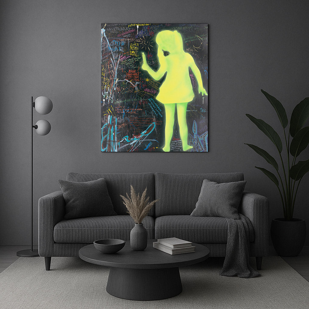 Das Bild zeigt eine eindrucksvolle Silhouette eines Mädchens, die in einem leuchtenden Gelbgrün dargestellt ist. Diese Figur steht im Mittelpunkt der Komposition und hebt sich stark von dem dunklen, fast schwarzen Hintergrund ab. Der Kontrast zwischen der hellen Silhouette und dem dunklen Hintergrund zieht sofort die Aufmerksamkeit auf sich.