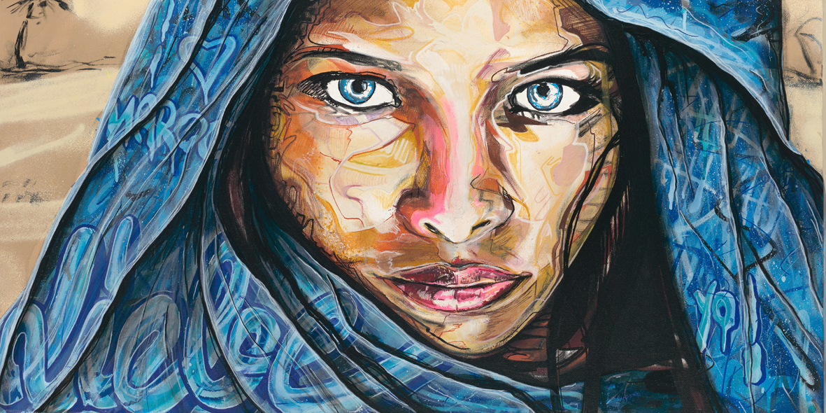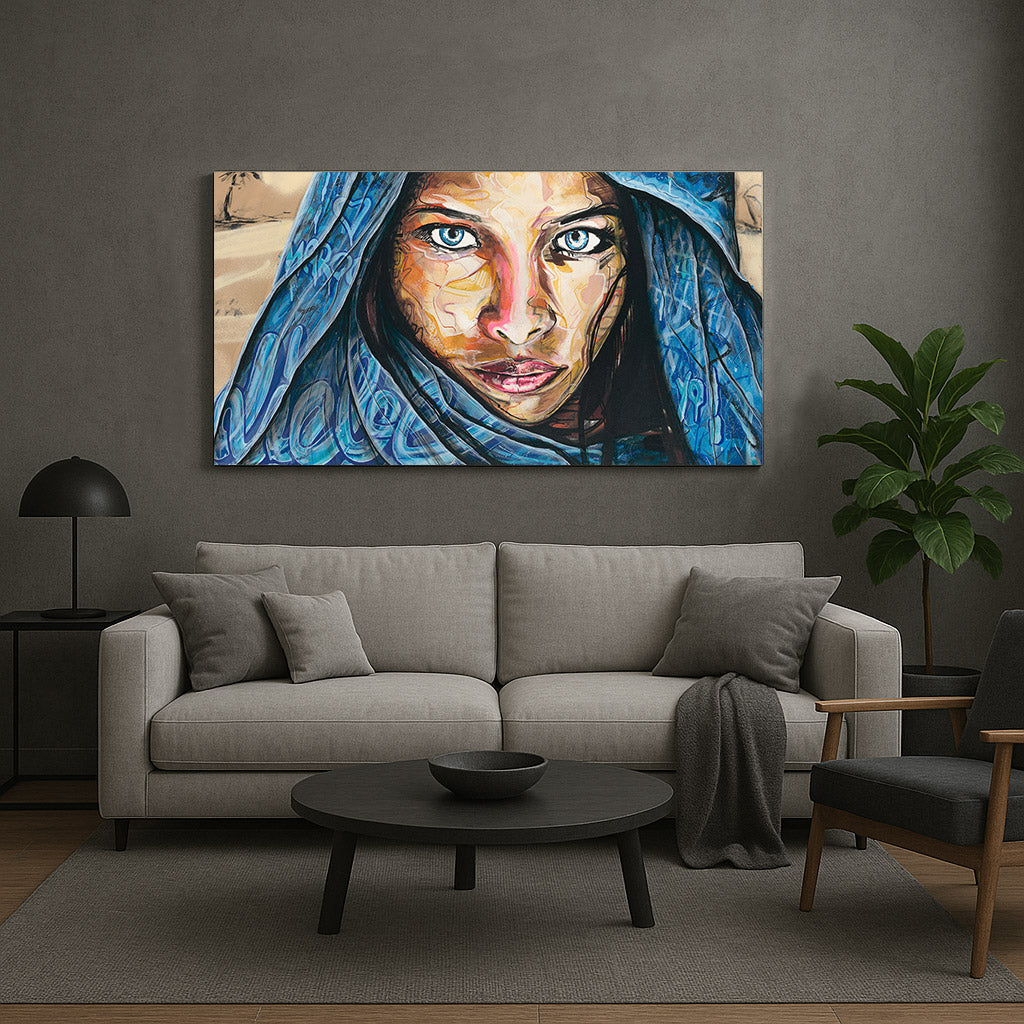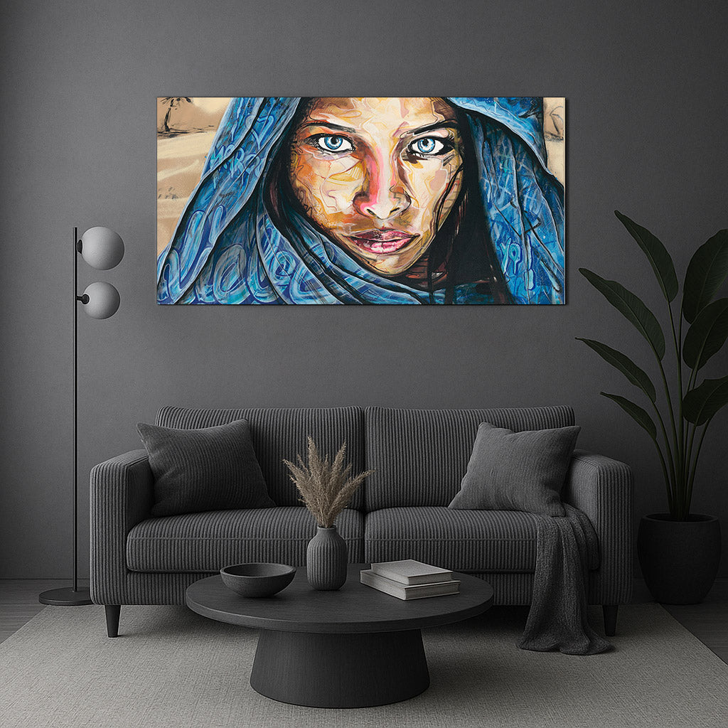 Die Frau trägt ein tiefblaues Tuch oder einen Schal, der sich elegant um ihren Kopf und ihr Gesicht legt. Die verschiedenen Blautöne, die im Stoff verwendet werden, erzeugen eine dynamische Textur, die den Eindruck von Bewegung und Tiefe vermittelt. Der Kontrast zwischen dem Blau des Schals und den warmen Tönen ihres Gesichts verstärkt die emotionale Wirkung des Porträts.