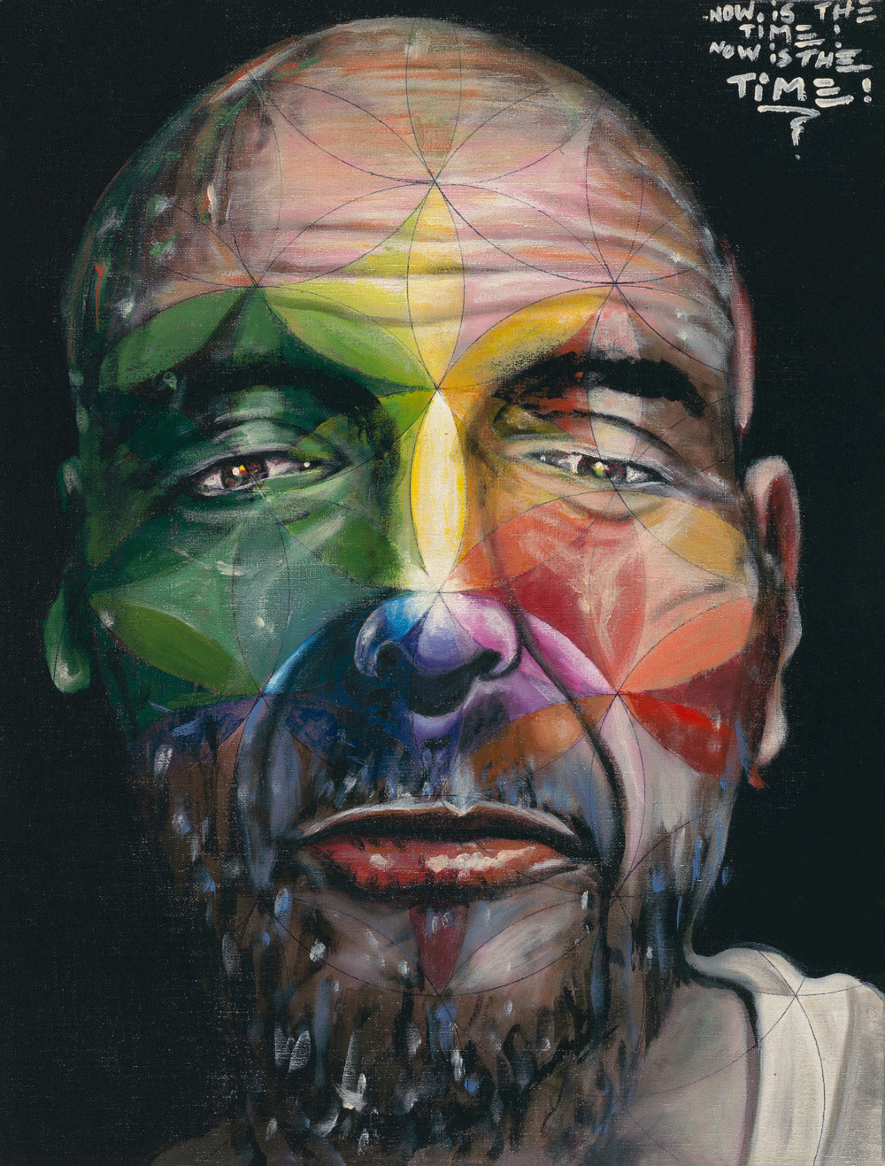 Der Ausdruck des Mannes ist ruhig, aber gleichzeitig nachdenklich, was durch die sanften Linien und Schattierungen um seine Augen und Lippen unterstrichen wird. Die Verwendung von Licht und Schatten verleiht dem Bild Tiefe und Dimension, während die geometrischen Formen eine hypnotisierende Wirkung erzeugen.