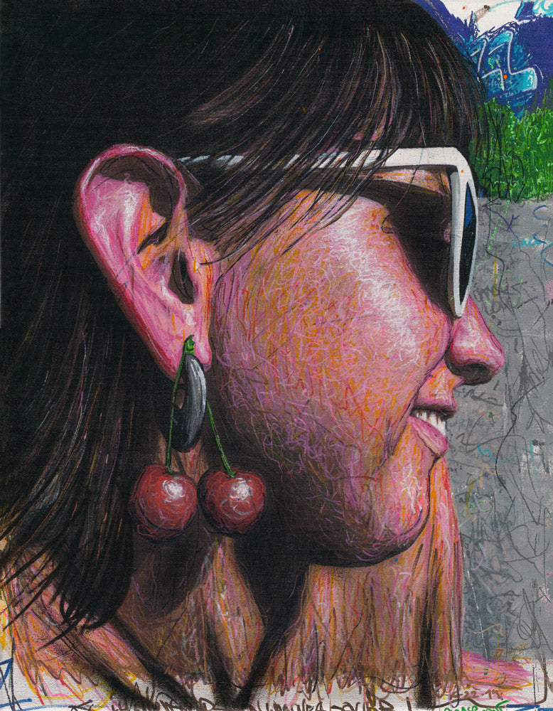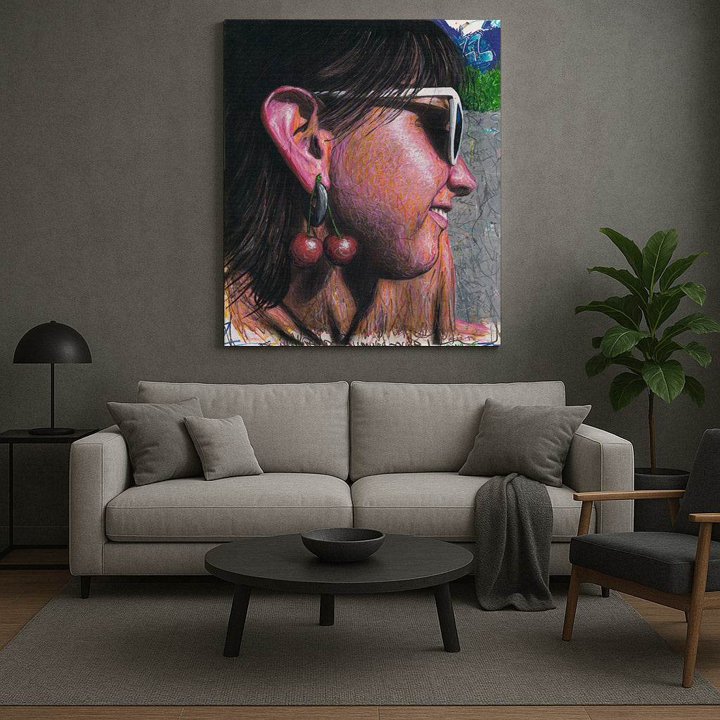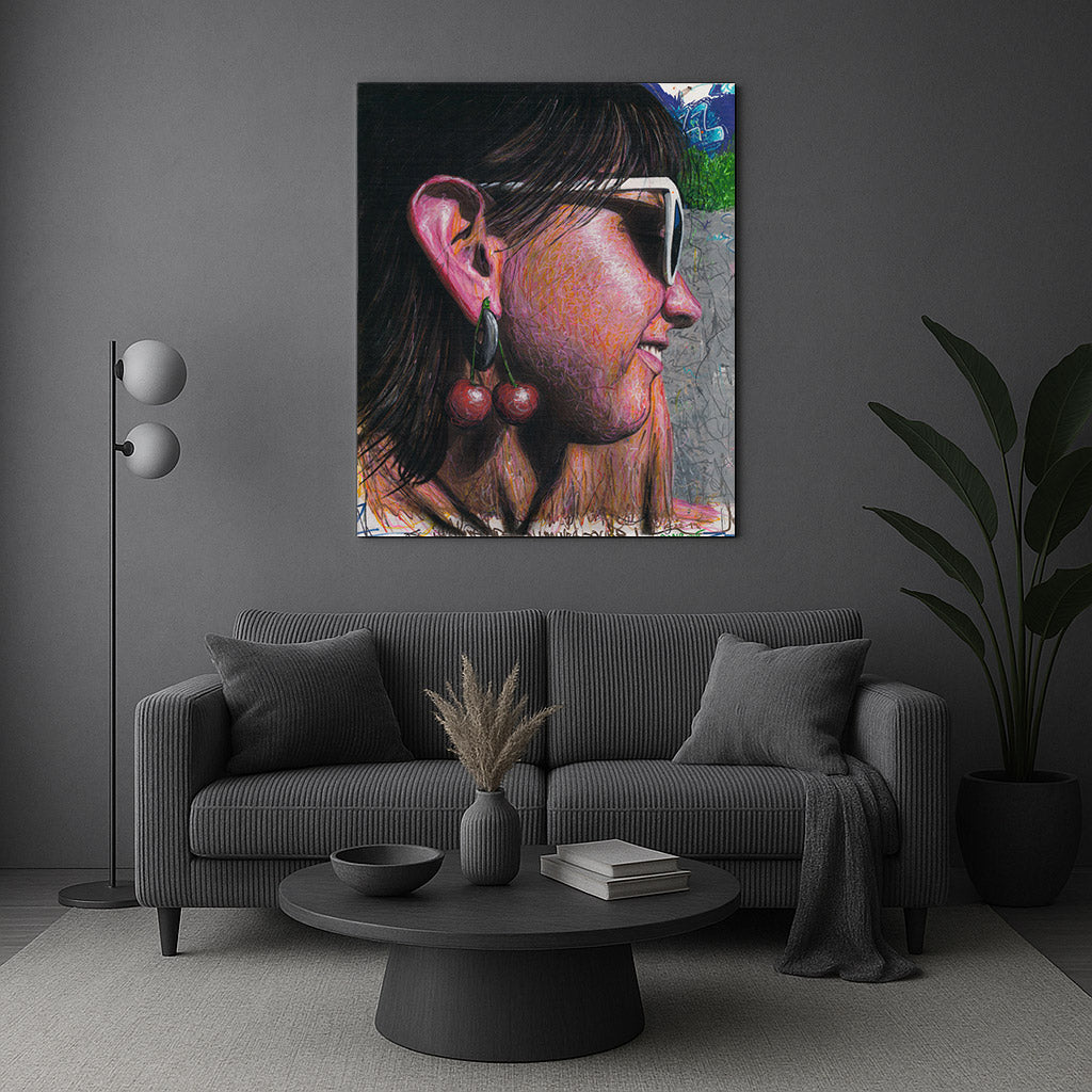 Das Bild zeigt ein lebendiges Porträt einer jungen Frau im Profil, die mit einem fröhlichen und entspannten Ausdruck dargestellt ist. Sie trägt eine modische Sonnenbrille und hat auffällige Ohrringe in Form von Kirschen, die ihren Look betonen und eine verspielte Note hinzufügen.