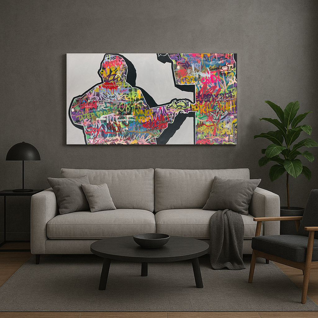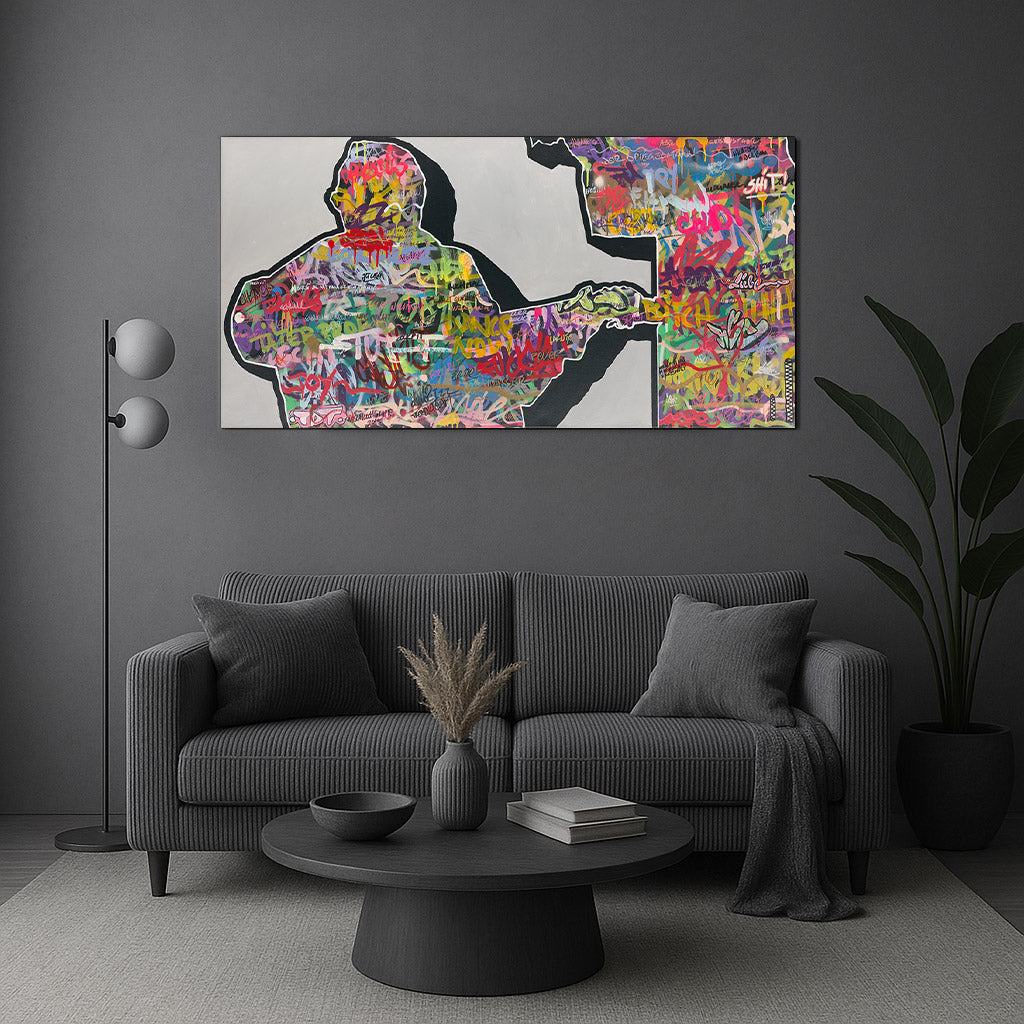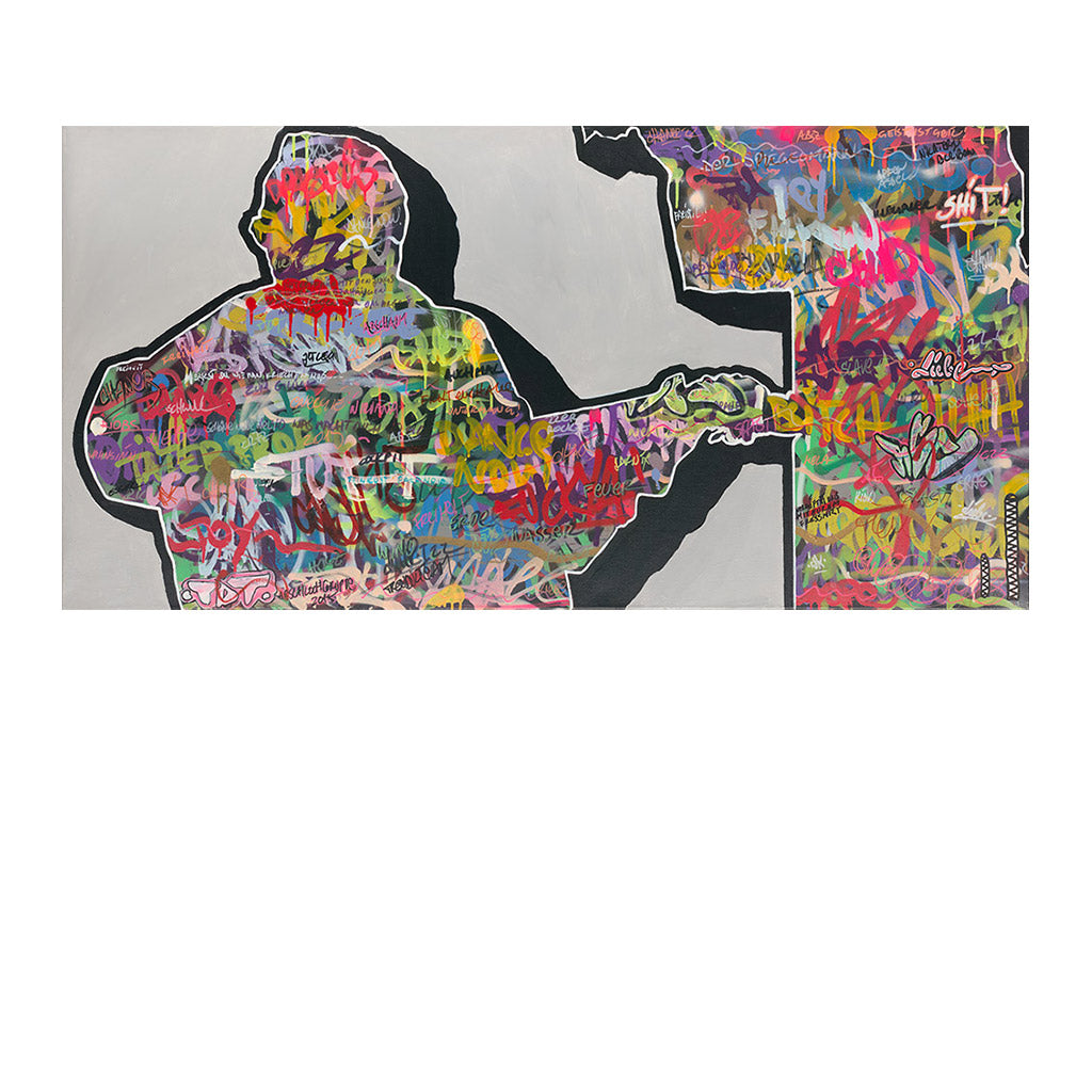Das Bild ist eine kraftvolle und ausdrucksstarke Komposition, die eine stilisierte menschliche Silhouette zeigt, die von einer Vielzahl von Graffiti-Elementen umgeben ist. Die Figur, die eine dynamische Pose einnimmt, scheint mit der Umgebung zu interagieren, was durch die bunte Vielfalt an Farben und Schriftzügen verstärkt wird.