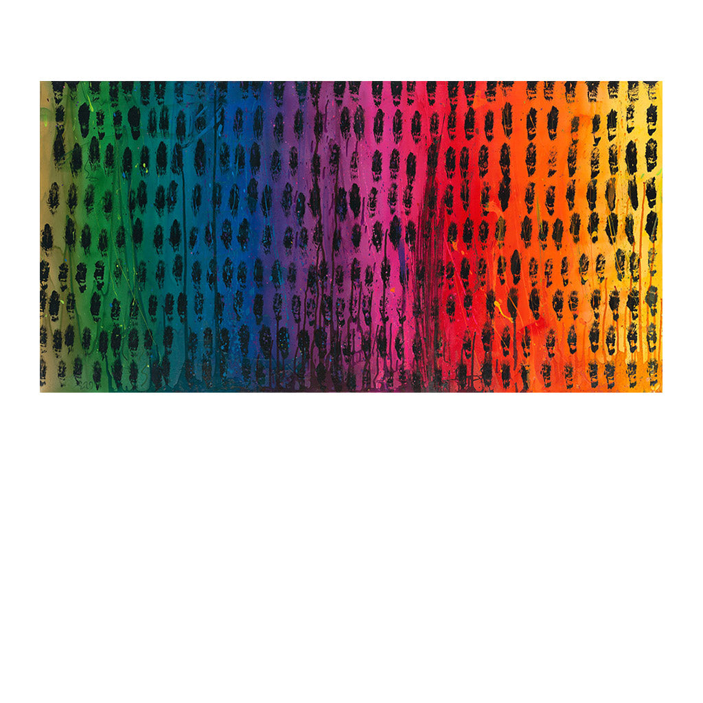 Im Vordergrund sind stilisierte, wiederholte Formen oder Muster in schwarzer Farbe zu sehen, die einen starken Kontrast zu den lebhaften Hintergrundfarben bilden. Diese schwarzen Elemente sind konsistent angeordnet und erzeugen eine strukturierte, rhythmische Wirkung, die dem Bild Tiefe und Textur verleiht.