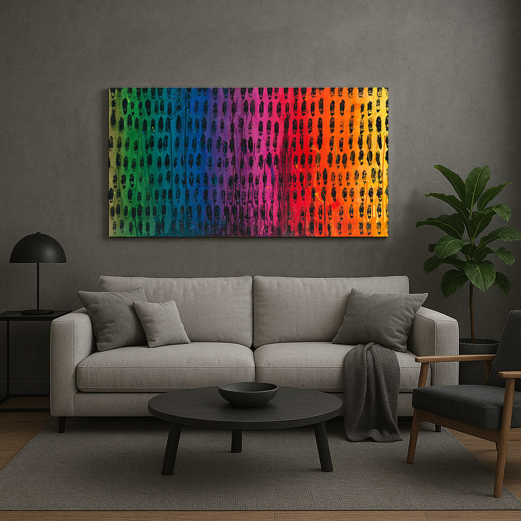 Das Bild ist eine faszinierende und lebendige Komposition, die sich durch ein beeindruckendes Farbenspiel auszeichnet. Es zeigt einen sanften Farbverlauf von leuchtendem Gelb über grüne, blaue und violette Töne bis hin zu warmen Rottönen und schließlich einem strahlenden Orange. Diese Farbtöne scheinen harmonisch ineinander überzugehen und schaffen eine dynamische Atmosphäre.