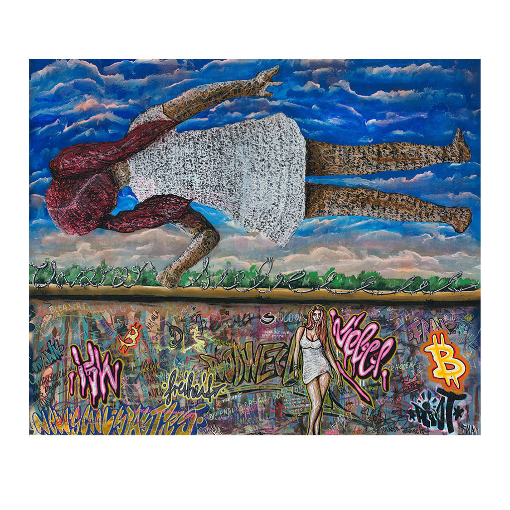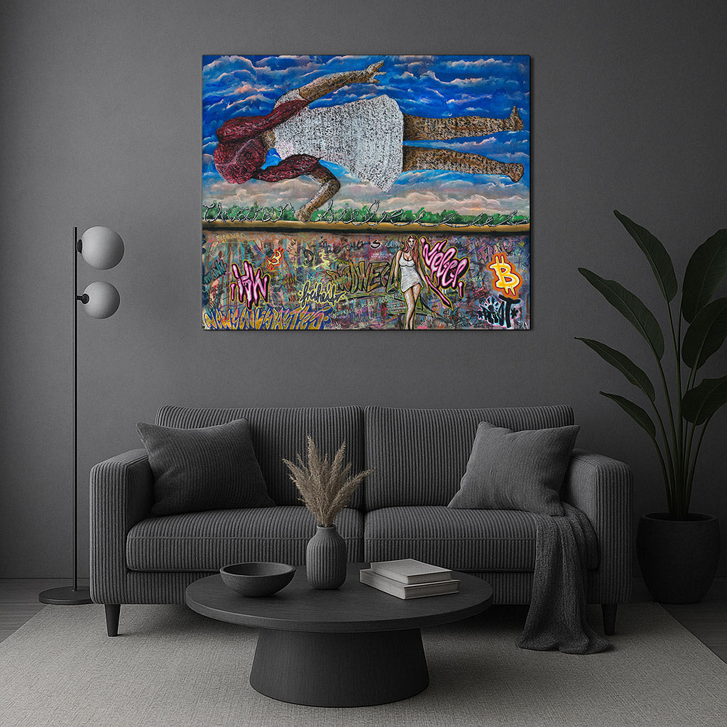 Die Kombination aus der schwebenden Figur und den urbanen Graffiti schafft einen starken Kontrast zwischen der Leichtigkeit des Fliegens und der Erdgebundenheit der Stadt. Das Bild regt dazu an, über Themen wie Freiheit, Identität und die Verbindung zwischen Natur und urbanem Leben nachzudenken. Die Verwendung von kräftigen Farben und dynamischen Formen verstärkt die emotionale Wirkung und zieht den Betrachter in die Szene hinein.
